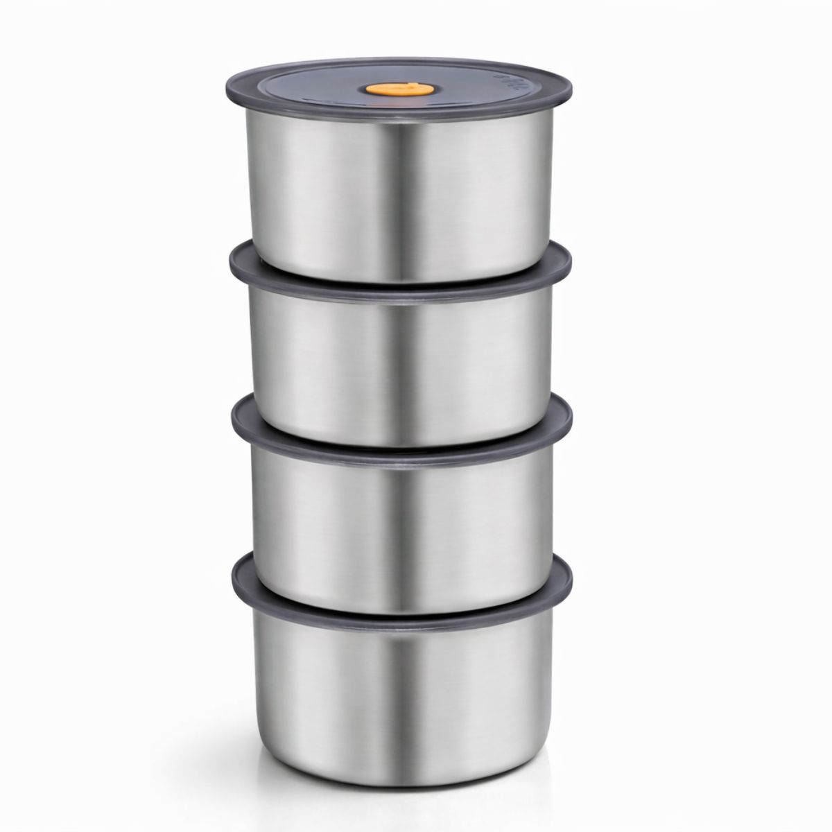 FICHA TÉCNICA E CONTEÚDO Tipo: Conjunto Potes Herméticos Formato: Redondo Capacidade: 450ml por unidade Material: Aço Inox / Plástico Quantidade: 4 Unidades Diâmetro: 11,5 cm Altura: 5,8 cm Cor: Inox / Prata Vedação: Sim Empilhável: Sim Peso Total: 246g Livre BPA: Sim