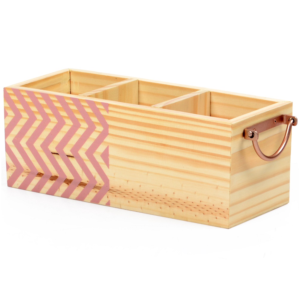 - Fabricado em Madeira Pinus - Possui 3 Divisórias - Possui um charmoso desenho lateral em forma de Zig Zag - Possui 2 alças em Ferro - Medidas: 10x18x10cm (AXLXC)